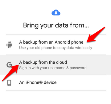 - Make sure both phones are connected to the same WiFi, and then select either **A backup from an Android phone** or **A backup from cloud** (if you don’t have the old phone) on the restore options screen.