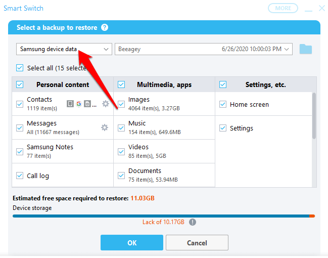 - If there’s any information you don’t want to copy, deselect it, click **OK**, and then go back and click** Restore** now, and **Allow** or **OK** to start the transfer process.