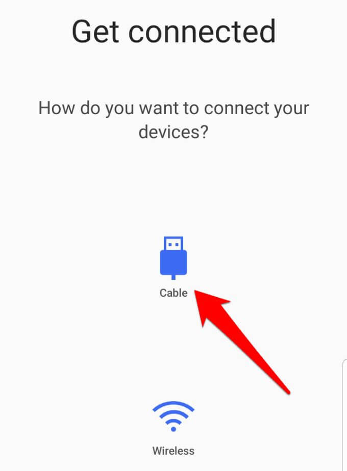 - Next, go to the Smart Switch interface on the old phone and select **Cable.**