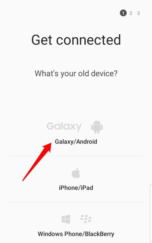 - Next, select the old device by tapping the **Galaxy/Android** option.