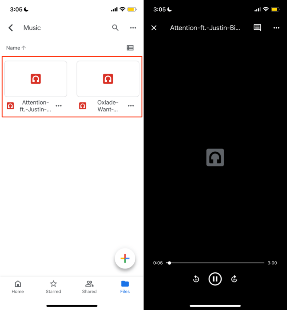 - Launch the **Google Drive app** on your iPhone and open the folder containing the songs you uploaded from your PC. Tap a song to play it in the Google Drive app.