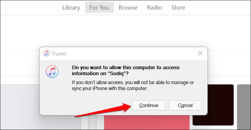 - Launch iTunes and select **Continue** on the authorization prompt.