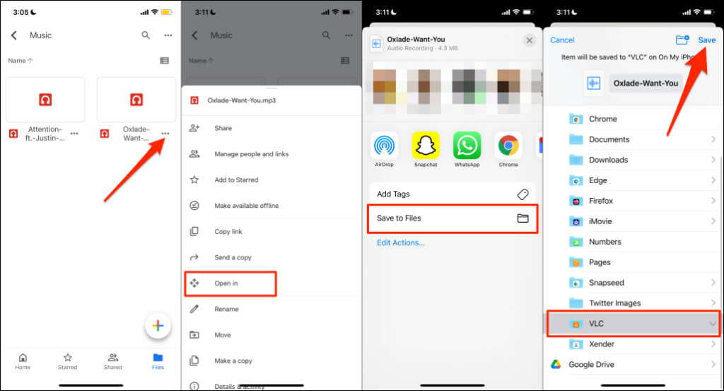 - To download a song to your iPhone, tap the **three-dot menu icon** below the song and select **Open in**. * Tap **Save to Files** on the Action Menu. * Select your media player’s app folder and tap **Save**. If you don’t have a media player, save the file in a new or pre-existing folder.