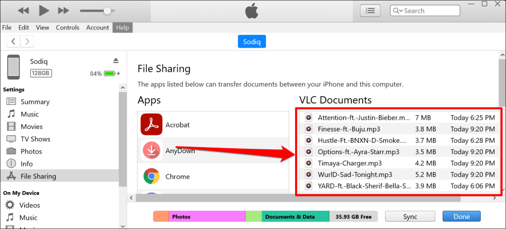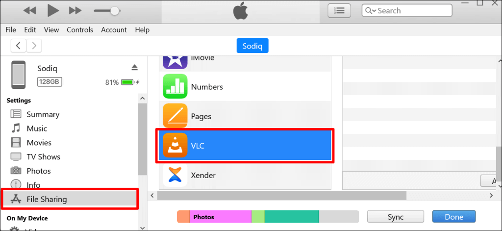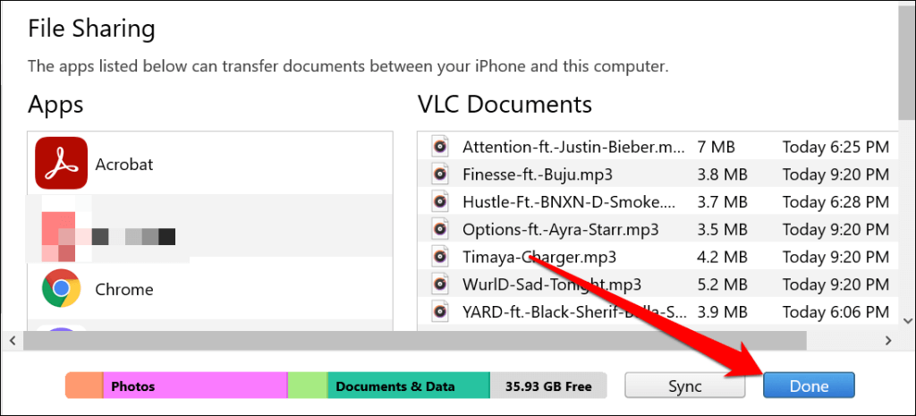 You can select any app, but we recommend using a media player as the intermediary or File Sharing app. The songs are added to the music library in the media player app on your iPhone. We’ll use the VLC Media Player as the File Sharing app for this tutorial.