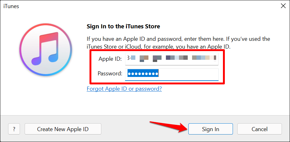 - Enter your **Apple ID email** and **password** in the dialog boxes and select **Sign In**. Proceed to the next step when iTunes syncs and displays your music library.