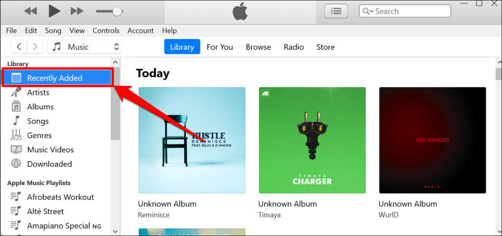 - Select **Recently Added** in the “Library” section of the sidebar to view the songs in your music library.