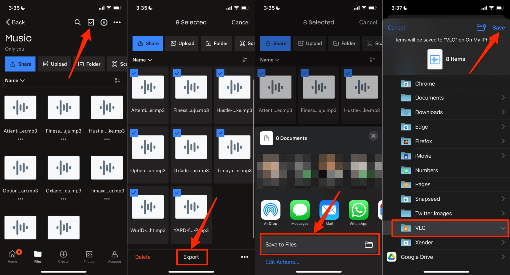 - Launch the Dropbox app on your iPhone and open the songs folder. Tap the **select icon** in the top-right corner and select the songs you want to transfer to your iPhone. * Tap **Export** and select **Save to Files** on the Action Menu.