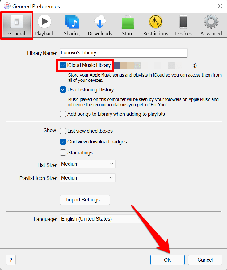 - Head to the **General** tab, check the **iCloud Music Library** box, and select **OK** to save the change.