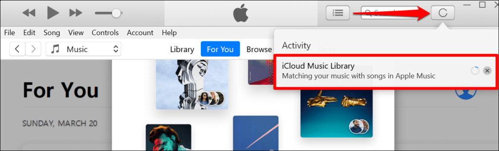 - iTunes will upload the songs to your Apple Music library on all devices linked to your Apple ID. Select the **moving circle icon** next to the search bar to check the song upload/transfer progress.