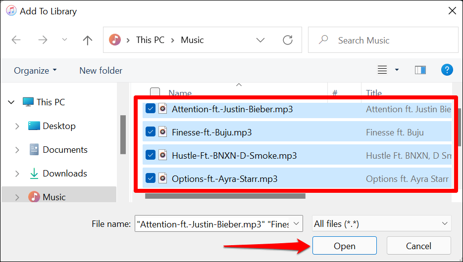 - Select the songs you want to transfer and select **Open**.