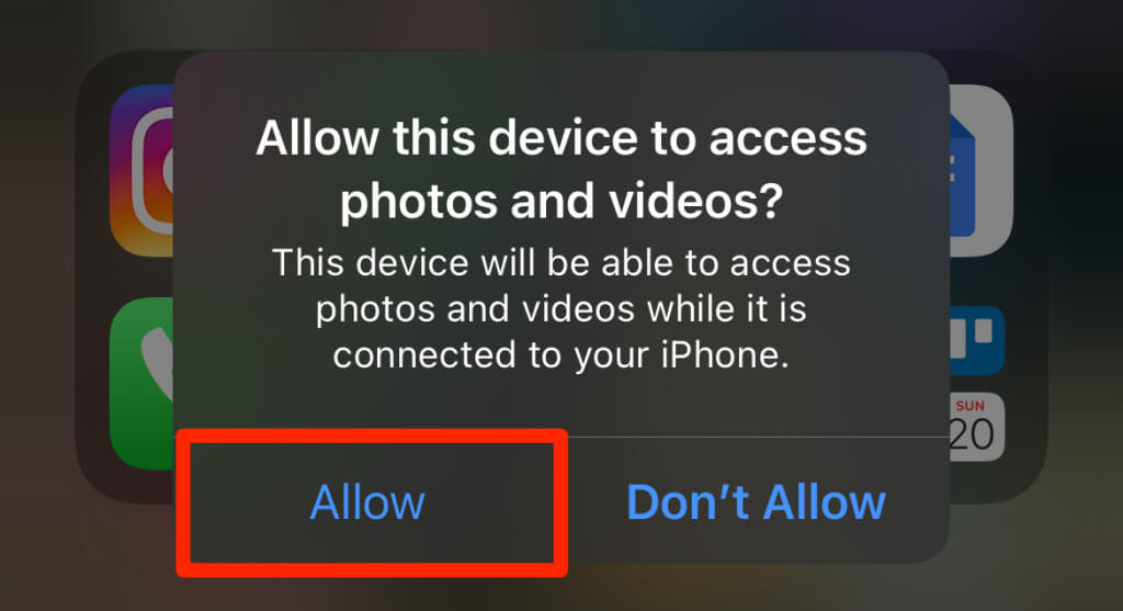 - Tap Allow on your iPhone to grant your PC access to your media files.