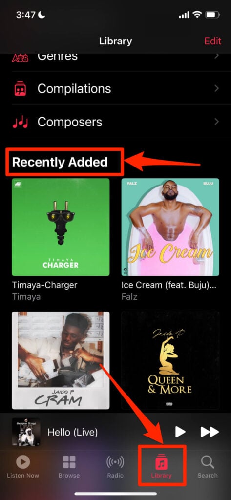 Open your iPhone’s Music app, head to the Library tab, and check the “Recently Added” section. You should see the songs you uploaded to the iCloud Music library on the list.