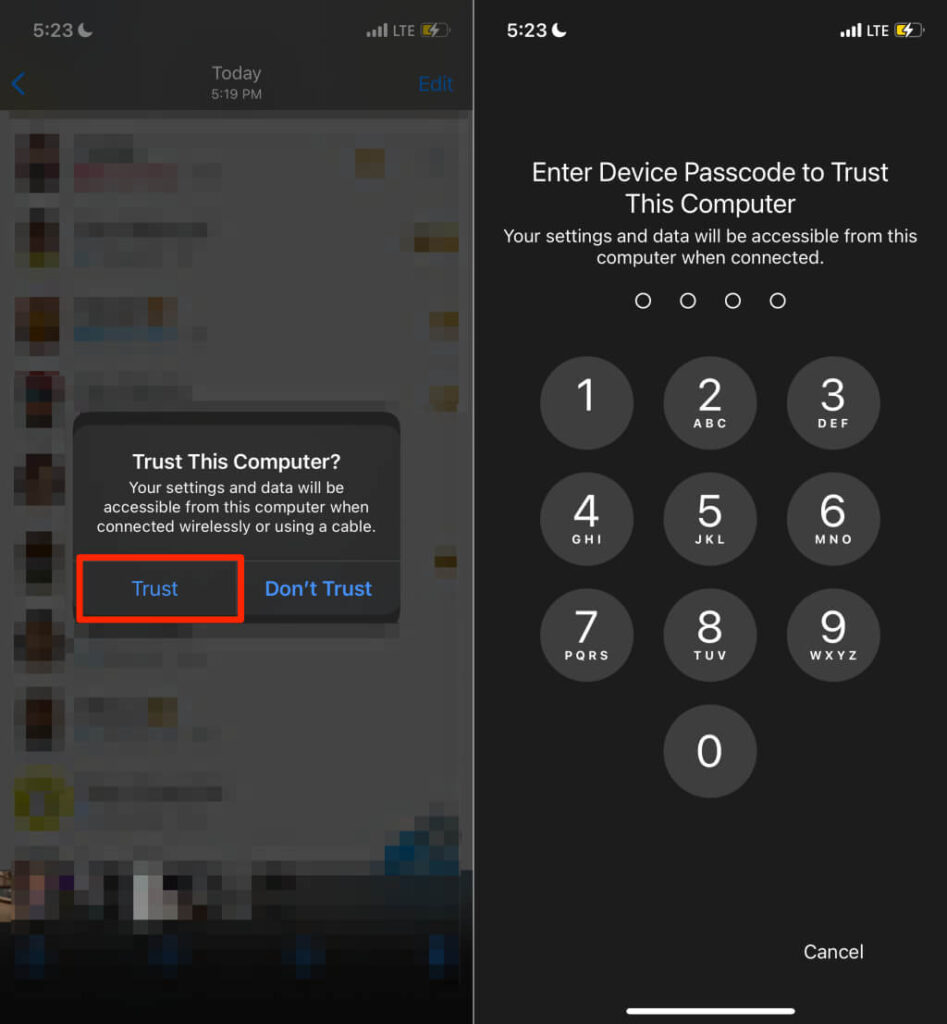 - Next, unlock your iPhone, tap **Trust** on the prompt, and enter your iPhone’s passcode.