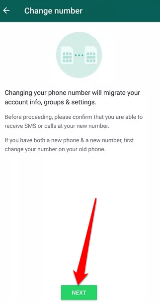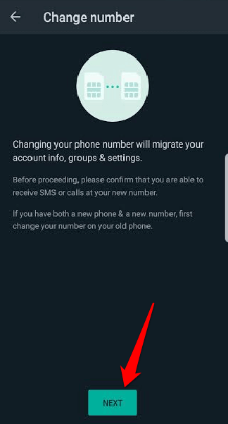 - You’ll get a message saying “**Changing your phone number will migrate your account info, groups & settings**”. Tap **Next**.