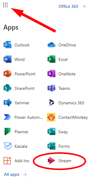 - * Log into your Microsoft 365 account in a web browser, open the list of apps via the checkerboard icon in the top-left corner of the page, and select Stream.