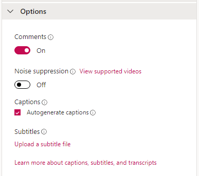 - Next, set the **Options** for your video. These include turning comments on or off, turning on Noise suppression, using auto generated captions, or uploading a subtitles file.