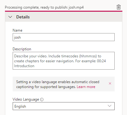 - Drag the video file you want to upload into the Stream browser window or select the link to **browse **your files and select the video you want to upload. * Once your video has uploaded, you can add some details. Give your video a **Name** and **Description**. If you want to enable automatic closed captioning, set the **Video Language**.