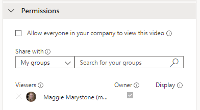 - Set the permissions for your video. Watch out, because videos are automatically set to be viewable by anyone in your organization! Uncheck that box if you want to restrict viewing. You can opt to share your video with specific people, a particular Channel on Microsoft Teams, or a group.