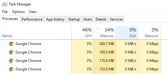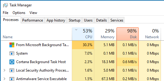 On the main Processes tab, you’ll see a quick overview of the CPU, Memory, Disk and Network utilization. For me, unless I’m doing something on the computer, the disk usage is normally right around 0. In a bad case, you’ll see something like below where disk usage is 100% or very close to it.
