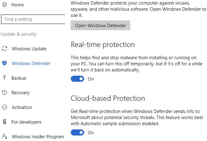To check if Windows Defender is disabled or not, click on Start, then Settings, Update & Security and then** Windows Defender**. Make sure Real-Time protection and** Cloud-based Protection** are turned Off.