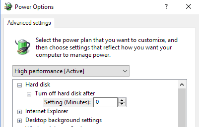 To avoid this problem, go to Power Options and select the High Performance power plan. In addition, click on Change plan settings and then expand Turn off hard disk after and set the minutes to 0.
