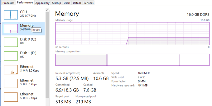 As you can see, I have 16 GB of memory and about 6 GB is in use. This means if you have 4 GB of RAM on your computer, all the memory would be exhausted. Everything that can’t be fit into memory is paged to the hard disk. So basically Windows will use your hard disk as a temporary memory device.