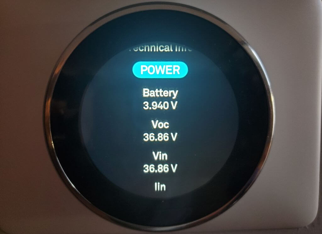 Check the Voc, Vin, or Lin values to ensure they’re showing that the Nest is receiving power and that the Battery is getting at least 3.7V of power. If it isn’t, remove the display and make sure that the C wire (known as the common wire) is connected properly.