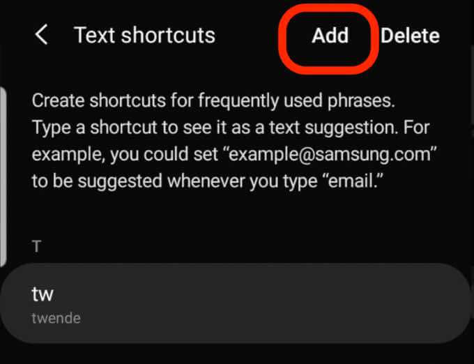 - Enter the shortcut and expanded phrase, and then tap **Add**.