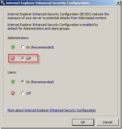 A dialog will pop up where you can disable IE ESC for either Administrators or Users. Click Off to turn off IE ESC for whichever group you prefer.