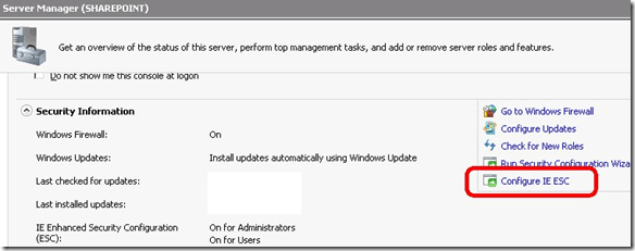 Under the** Security Summary** section, click on** Configure IE ESC**.