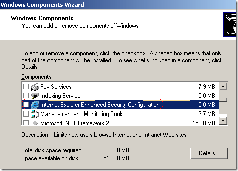 In Windows Server 2003, you can turn off enhanced security for IE by going to Start, Control Panel, and then Add or Remove Programs.