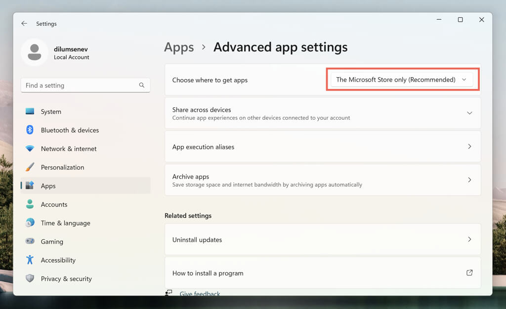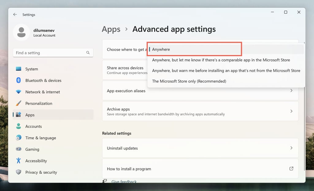 - Open the drop-down menu next to Choose where to get apps.