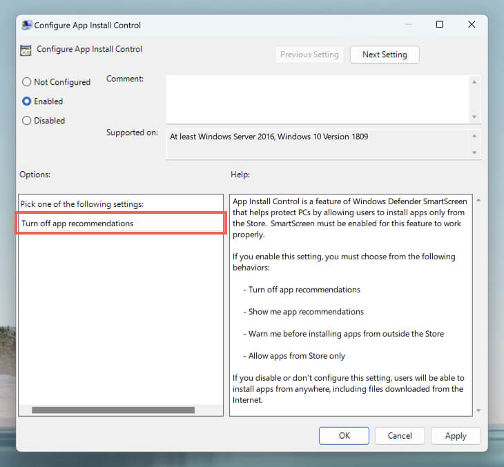 - On the “Configure App Install Control” dialog, select the radio button next to Enabled and pick the Turn off app recommendations setting under Options.