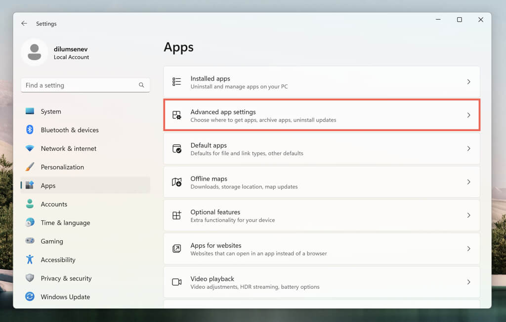 - Select Apps on the left sidebar and choose the Advanced app settings category.