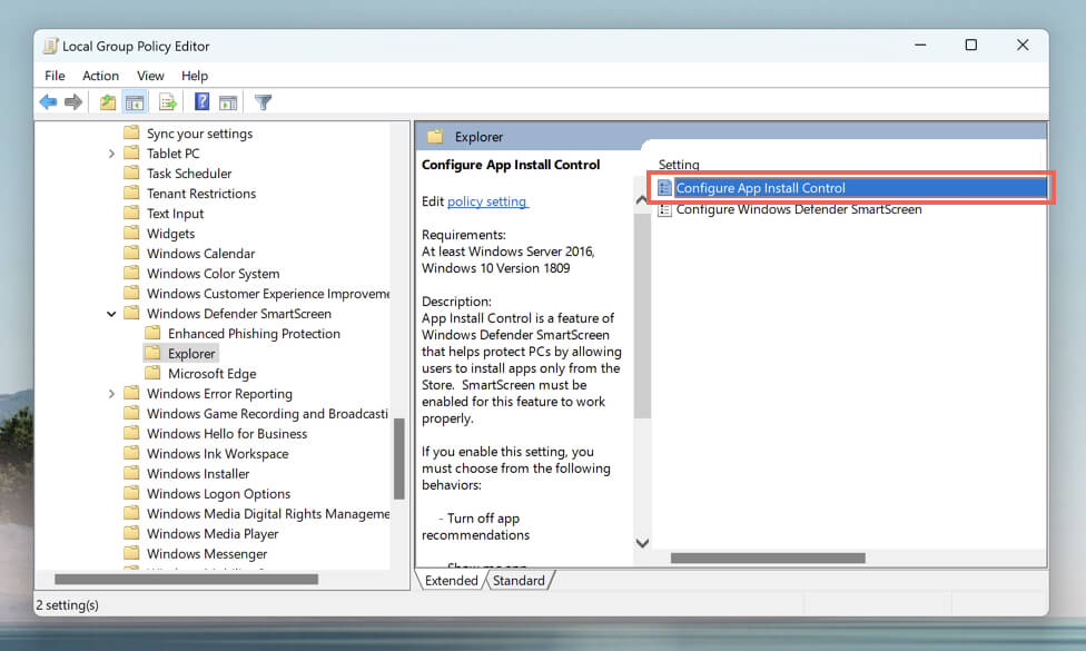 - Go to Computer Configuration > Administrative Templates > Windows Components > Windows Defender SmartScreen > Explorer and double-click the Configure App Install Control policy.