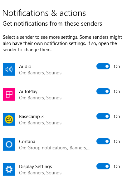 Windows 10 allows you to select whether you want to hear or view a combination of banner notifications. These notifications comprise pop ups in the bottom right side of your display and sounds. You can also configure app settings to only display notifications within the Action Center and turn off pop-up notifications on your screen as you work or play.