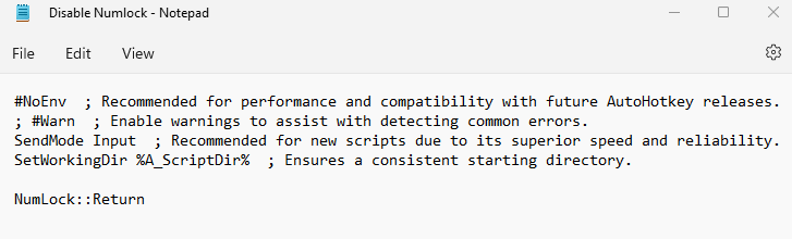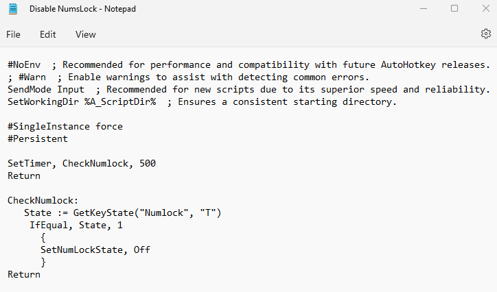 AHK is a lightweight utility for remapping keys and creating custom hotkeys for Windows 10 and 11. And while it uses scripts, simple things like creating key binds take very little code. For example, we can disable Numlock using a single line: