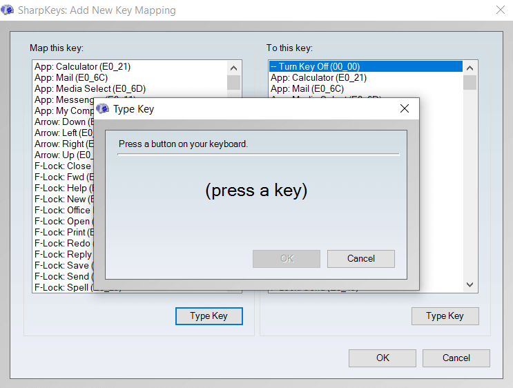 - Manually finding a specific key can take a while, so select Type Key below the left pane and hit the Numlock key on your keyboard. After SharpKeys has detected the keypress, select OK to continue.