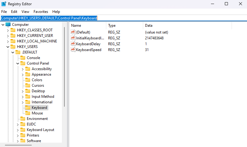 - Navigate to HKEY_USERS.DefaultControl PanelKeyboard in the left panel. You can also append this address to the root in the address bar at the top like this: