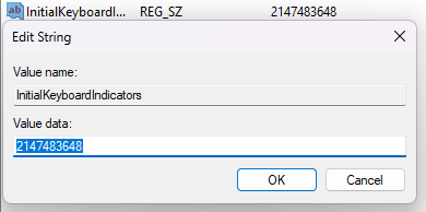 - You will see a bunch of keys on the right side including one named InitialKeyboardIndicators. Double-click on this entry to modify its value.
