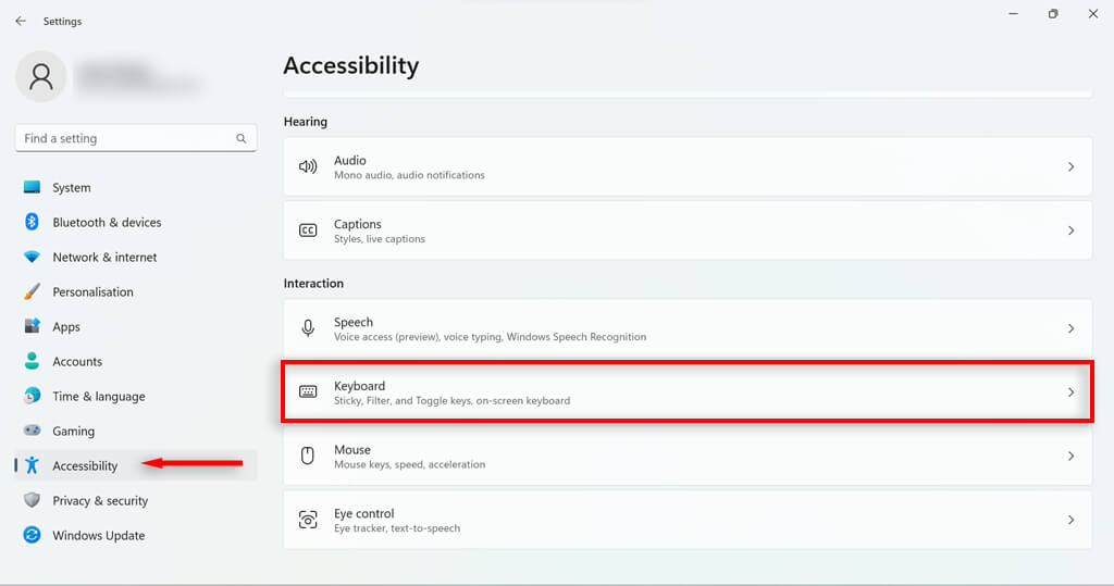 - In the Settings Menu on the left-hand side, select Accessibility. * Scroll down to the Interaction section and select Keyboard.