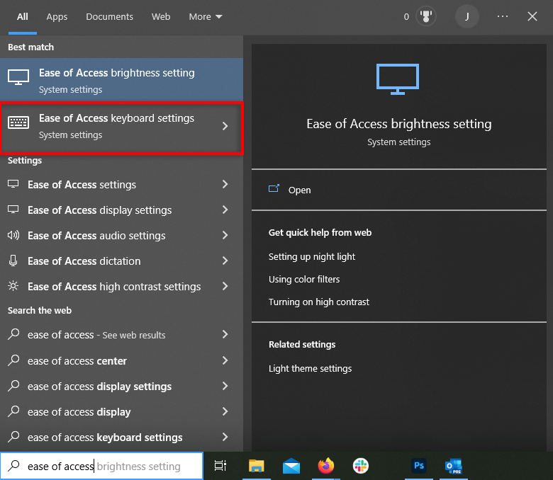 - * In the Search Bar, type Ease of Access and then select Ease of Access Keyboard Settings.