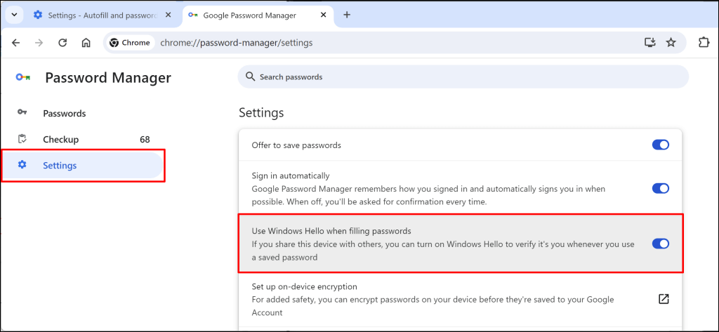 Follow the steps below to stop Chrome Password Manager from requesting Windows Hello verification before auto-filling passwords.