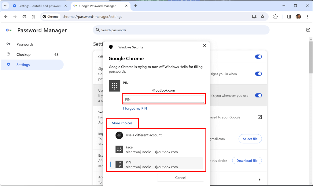 - Enter your computer’s Windows Hello PIN in the dialog to proceed. Select More choices to switch accounts or Windows Hello options to face or fingerprint authentication.
