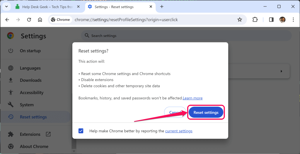 Resetting Chrome won’t delete browsing history, bookmarks, passwords, fonts, and accessibility settings.