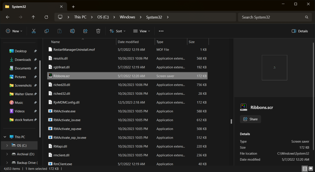 In that folder, screen saver file names typically match the screen saver name and have a .SCR extension at the end. For example, the file for the Ribbons screensaver is named Ribbons.scr.