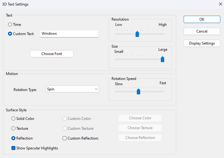 - On some types of screen savers (like 3D text), you can also select Settings… to customize its appearance further. It’s not available on options like ribbons, though.
