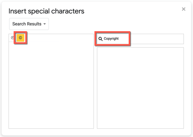 - Type Copyright into the search box or draw the symbol. * Select the © symbol among the search results to insert it.