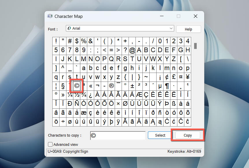 Note: If you have trouble locating the copyright symbol, check the box next to Advanced view, set Group by to Unicode Subrange, and select General Punctuation.