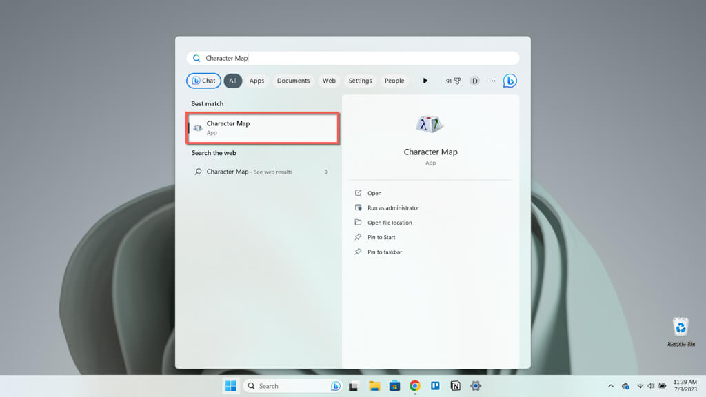 - Open the Start menu, type Character Map, and select Open. Or, launch it with the charmapRun command.